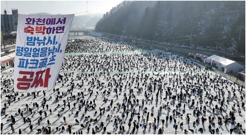 [이슈라인=장사라 기자] 찬바람이 불어오는 화천천 위, 얼음판이 하얗게 빛난다. 강원도의 겨울을 상징하는 화천 산천어 축제가 오는 1월 10일부터 2월 1일까지 열리며, 올 겨울도 전국에서 몰려드는 관광객들을 맞이할 준비를 하고 있다. 현장을 찾은 순간, 눈밭 위로 쏟아지는 웃음소리와 얼음 위로 튀어 오르는 산천어들의 반짝임이 어우러져 마치 한 폭의 겨울 풍경화를 보는 듯한 느낌이다.