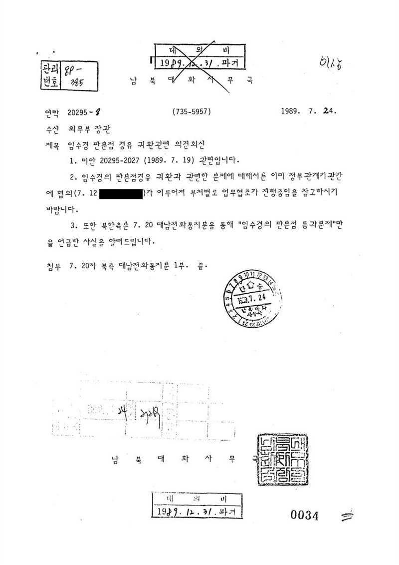 외교부는 2020년, 국민의 알 권리 차원에서 1989년 외교문서 24만 쪽을 공개했지만, 임수경 관련 문건은 '개인정보'라는 이유로 비공개 처리했다. 정권 핵심 인사의 과거가 총선을 앞두고 조명되는 것을 피하려 한 것 아니냐는 의혹이 제기됐다. 이번에 공개된 문건에는 민감한 개인정보는 없었고, 오히려 당시 정부가 유엔사와 외교적으로 어떤 갈등을 겪었는지, 북한이 어떻게 판문점 귀환을 기정사실화하며 정치적 퍼포먼스를 연출했는지가 담겨 있었다.