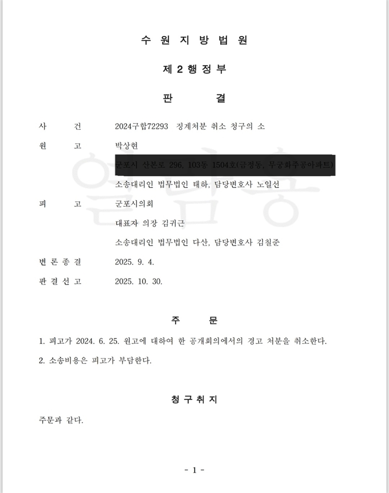 수원지방법원 제2행정부는 지난 10월 30일 선고한 징계처분 취소 청구 소송에서 군포시의회의 징계처분을 위법으로 판단했다.