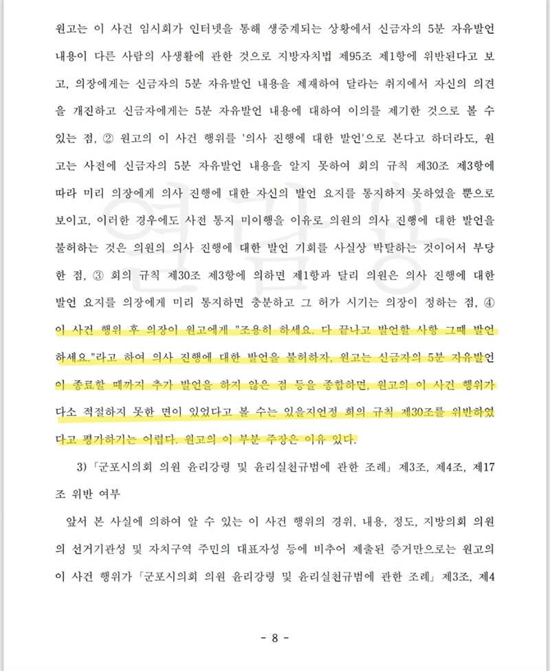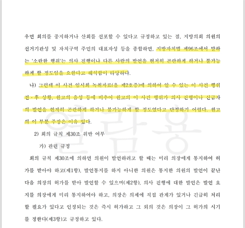 법원은 판결문에서 “원고의 행위가 의사진행이나 다른 의원의 발언을 현저히 곤란하게 할 정도였다고 단정하기 어렵다”며, “원고의 주장은 이유 있다”고 명시했다.